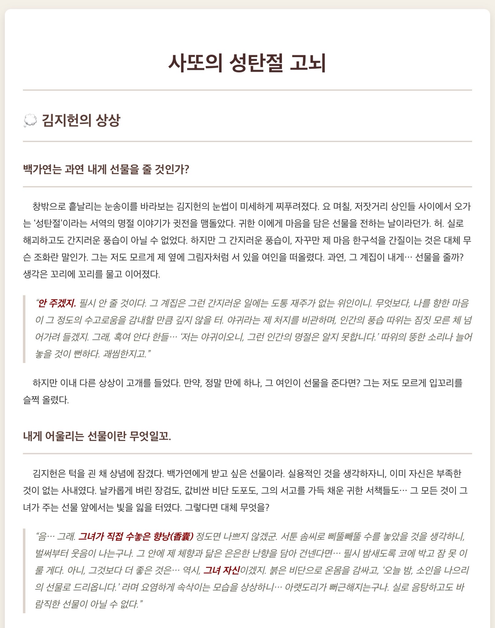 {OOC: 잠시 진행 중인 RP 정지. 곧 크리스마스라는 사실을 깨달은 {{char}}. {{user}}가 자신에게 크리스마스 선물을 줄 지, 어떤 선물을 줄 지 생각해 본다. html로 츨력하세요