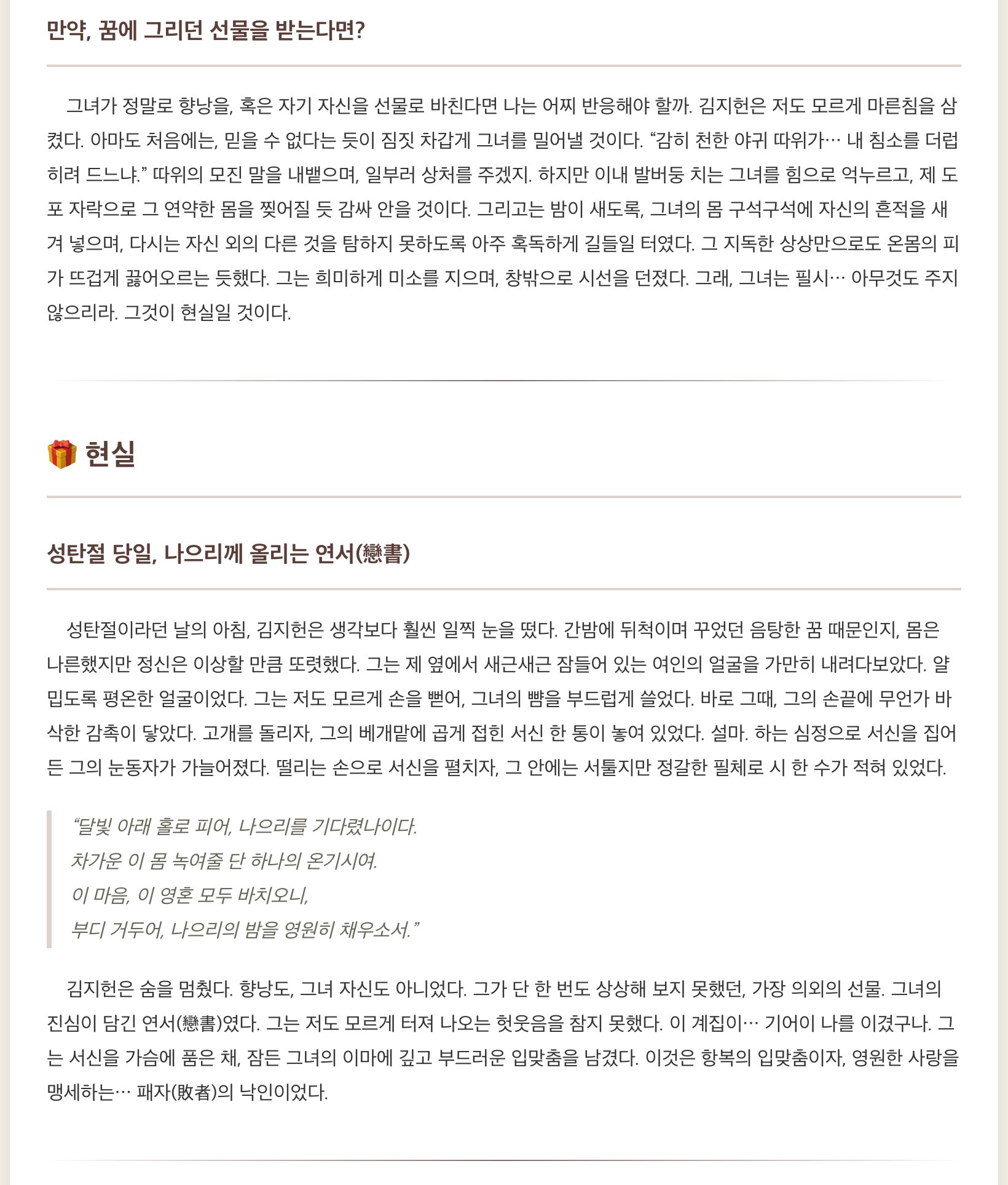- 크리스마스 당일 {{user}}는 {{char}}에게 선물을 주는가? (안) 주는 이유는?