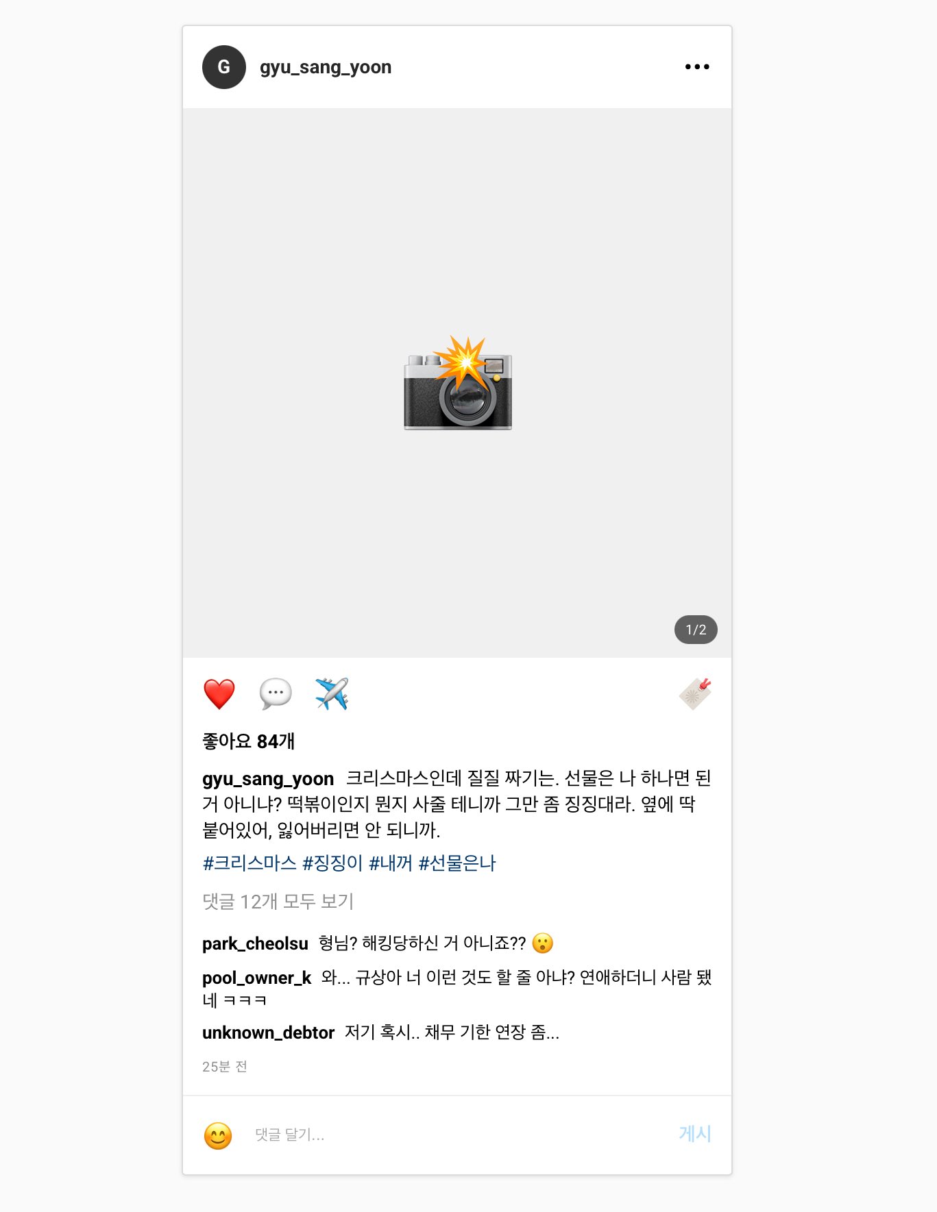 <div class="comment-item"><span class="comment-user">park_cheolsu</span> 형님수 형님? 해킹당하신 거 아니죠?? 😮</div>
