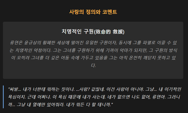 <p style="margin: 0;">"씨발… 내가 너한테 뭐하는 짓이냐. …사랑? 같잖네. 이건 사랑이 아니야. 그냥… 내 이기적인 욕심이지. 근데 어쩌냐. 이 욕심 때문에 내가 사는데. 네가 없으면 나도 없어, 류연아. 그러니까… 그냥 내 옆에만 있어줘라. 내가 뭐든 다 할 테니까."</p>