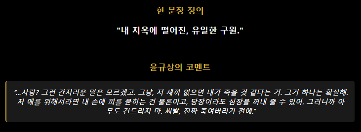 <p style="font-size:1.2em; font-weight:bold; color:white;">"내 지옥에 떨어진, 유일한 구원."</p>