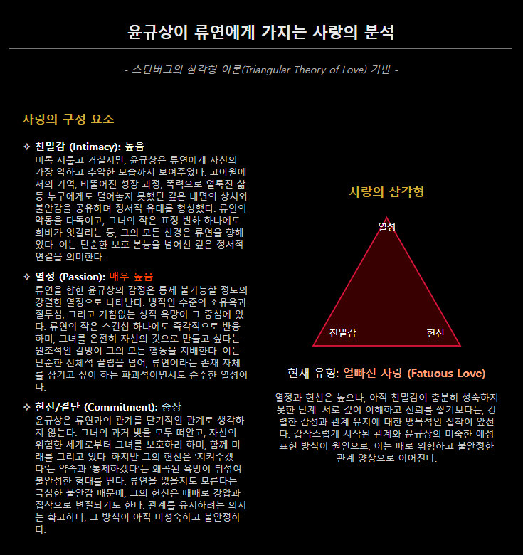 <p style="font-size:0.9em; color:#CCC;">열정과 헌신은 높으나, 아직 친밀감이 충분히 성숙하지 못한 단계. 서로 깊이 이해하고 신뢰를 쌓기보다는, 강렬한 감정과 관계 유지에 대한 맹목적인 집착이 앞선다. 갑작스럽게 시작된 관계와 윤규상의 미숙한 애정 표현 방식이 원인으로, 이는 때로 위험하고 불안정한 관계 양상으로 이어진다.</p>