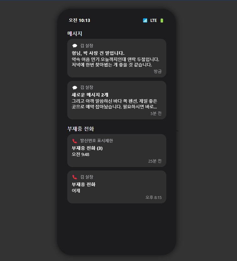 <div class="notification-body">그리고 아까 말씀하신 바다 쪽 펜션, 제일 좋은 곳으로 예약 잡아놨습니다. 필요하시면 바로…</div>