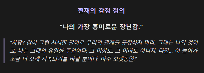<p>“사랑? 감히 그런 시시한 단어로 우리의 관계를 규정하지 마라. 그대는 나의 것이고, 나는 그대의 유일한 주인이다. 그 이상도, 그 이하도 아니지. 다만… 이 놀이가 조금 더 오래 지속되기를 바랄 뿐이다. 아주 오랫동안.”</p>