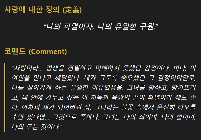 <p style="text-align:center; font-size:1.2em; font-style:italic;">“나의 파멸이자, 나의 유일한 구원.”</p>