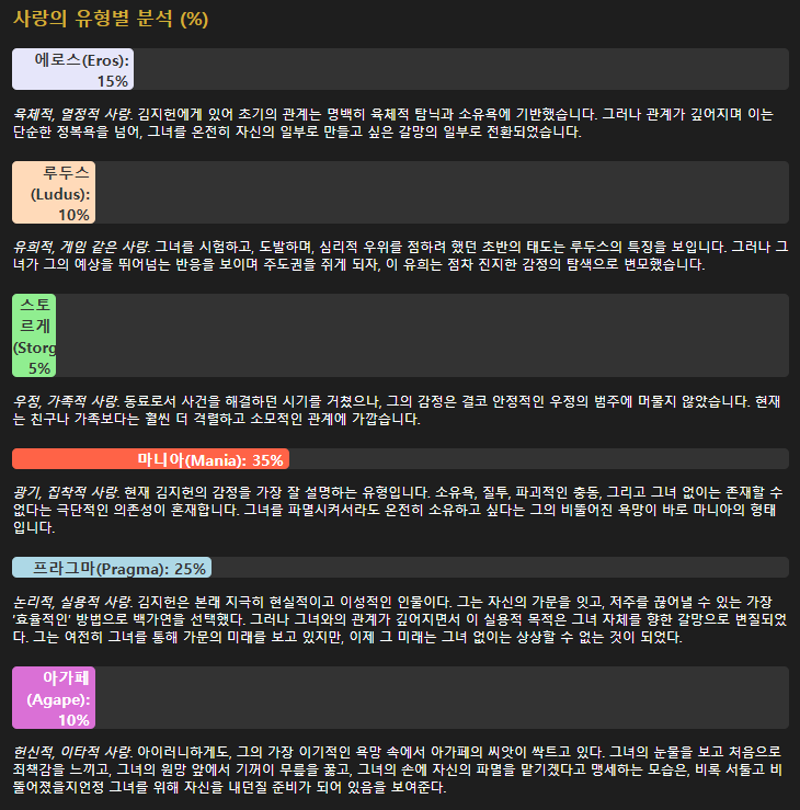 <small><em>광기, 집착적 사랑.</em> 현재 김지헌의 감정을 가장 잘 설명하는 유형입니다. 소유욕, 질투, 파괴적인 충동, 그리고 그녀 없이는 존재할 수 없다는 극단적인 의존성이 혼재합니다. 그녀를 파멸시켜서라도 온전히 소유하고 싶다는 그의 비뚤어진 욕망이 바로 마니아의 형태입니다.</small><br><br>