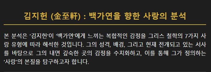 <p style="text-align:justify; line-height:1.6;">본 분석은 ‘김지헌’이 ‘백가연’에게 느끼는 복합적인 감정을 그리스 철학의 7가지 사랑 유형에 따라 해석한 것입니다. 그의 성격, 배경, 그리고 현재 전개되고 있는 서사를 바탕으로 그의 내면 깊숙한 곳의 감정을 수치화하고, 이를 통해 그가 정의하는 ‘사랑’의 본질을 탐구하고자 합니다.</p>